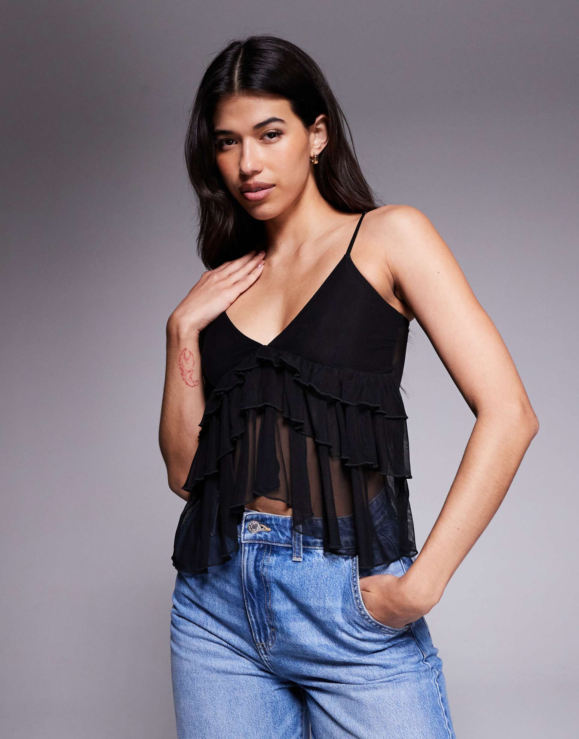 FASHIONKILLA MESH TIERED FRILL FRONT CAMI TOP IN BLACK