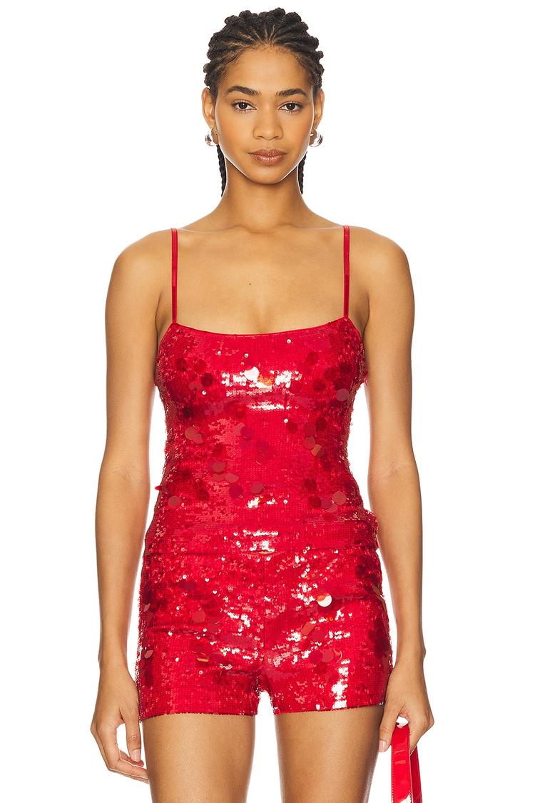 Vibrant red sequins shimmer across this fitted camisole, featuring a sleek straight neckline and delicate spaghetti straps for a flattering sleeveless silhouette. The waist-length hem and hidden side zipper closure offer a polished finish, while the midweight polyester-elastane fabric ensures comfort and stretch. Perfect for night outs, parties, and girls' night events, this trendy piece brings bold glamour with a chic and sexy vibe. Its all-over sequin design catches the light beautifully, making it a standout choice for festive or celebratory occasions.