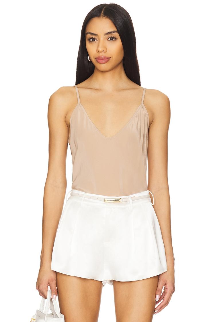 Soft matte beige silk with a lightweight satin finish creates a luxurious feel in this relaxed fit cami top. Featuring a flattering V-neck and delicate adjustable spaghetti straps, this hip length camisole offers effortless elegance and comfort. Its minimalist design and sleeveless style make it ideal for warm weather and versatile enough for casual outings, brunches, or date nights. The covered back and smooth fabric drape add to its sophisticated, chic appeal, making it a perfect staple for everyday wardrobe rotation or vacation wear.