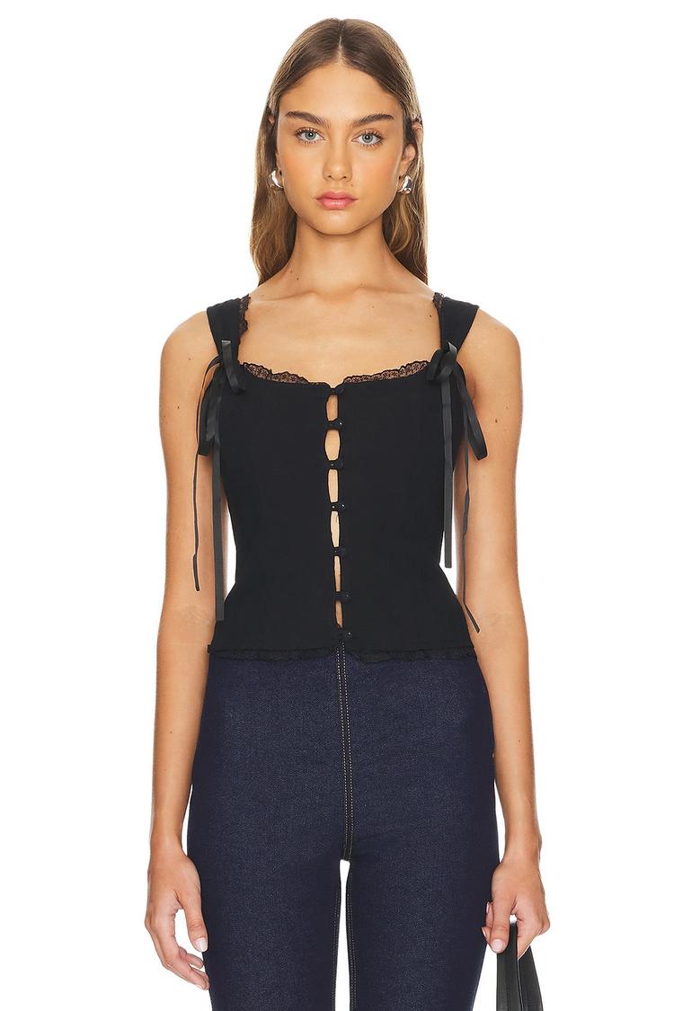 With its matte black cotton crepe fabric and delicate eyelash lace trim, this fitted camisole offers a refined yet playful look. The square neckline and wide straps with tie accents add charming details, enhanced by a front button closure for easy wear. Waist-length and sleeveless, it pairs beautifully for casual brunches, night outs, or date nights in warmer seasons. Elegant lace trims along the collar and sleeves give it a romantic edge while maintaining chic simplicity, making it a versatile wardrobe essential for spring and summer occasions.