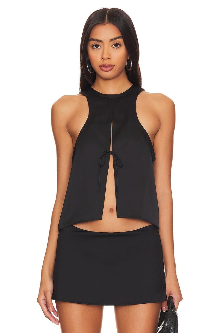 Sleek and sultry, this black satin camisole features a high neckline and sleeveless strapless styling for a modern edge. The cropped length and relaxed fit create a breezy silhouette, enhanced by the open front with a delicate tie-up closure that adds a subtle yet sexy detail. Crafted from a smooth polyester-elastane blend, it offers a lustrous sheen and comfortable stretch perfect for warm weather. Ideal for casual outings, night outs, or date nights, this versatile camisole effortlessly balances chic sophistication with playful allure.