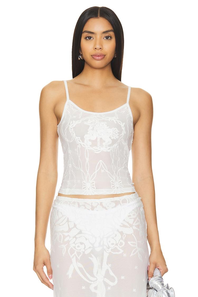 Softly embroidered floral lace adorns this fitted white cami, crafted from a semi-sheer polyester-spandex blend with delicate spaghetti straps and a flattering scoop neck. Its waist-length silhouette offers a minimalistic and chic vibe, perfect for warm spring and summer days. This elegant cami pairs effortlessly for casual outings, brunch dates, or romantic evenings, combining breathable comfort with a sophisticated edge. Slip it on with ease for a seamless style that elevates everyday and special occasion wardrobes alike.