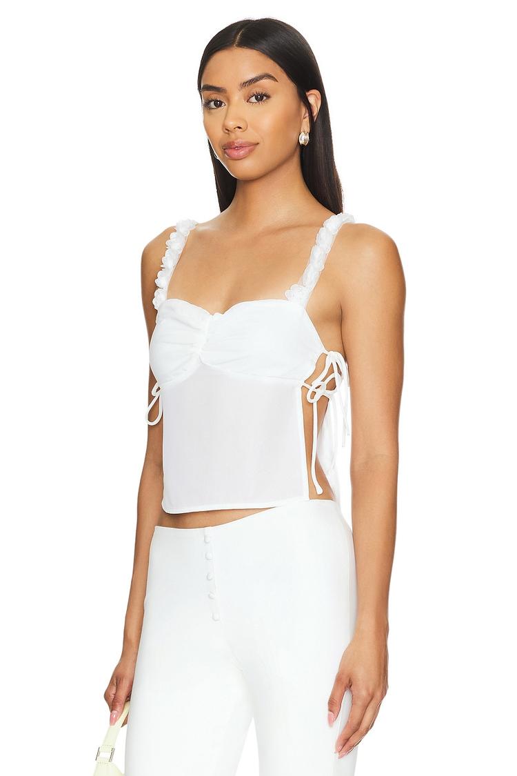 Delicate ruffled straps and a sweetheart neckline define this fitted white camisole crafted from semi-sheer polyester fabric. Its waist-length silhouette and tie-up side closures create a romantic and chic vibe, perfect for warm spring and summer days. Ideal for casual outings, brunch dates, or night outs, this cami pairs seamlessly with high-waisted bottoms for a fresh, feminine look.