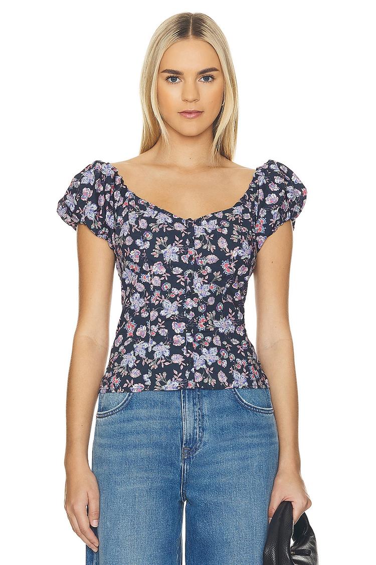 Delicate floral prints in dusty rose and purple bloom across a matte black background on this fitted camisole crafted from soft 100% Pima cotton. The romantic sweetheart neckline and puffed half sleeves with ruffled edges add charming detail to the waist-length silhouette. Ideal for spring and summer, this casual chic cami pairs perfectly with jeans for brunch, everyday wear, or relaxed outings, offering breathable comfort and flattering style in one versatile piece.