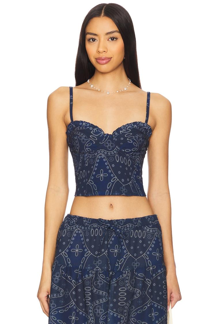 Delicate sweetheart neckline and adjustable spaghetti straps define this fitted cropped camisole in a matte dark blue polyester fabric. The all-over light blue abstract print adds a modern touch to the silhouette, while the underwire bust ensures a structured and flattering fit. Perfect for spring and summer, this chic and trendy piece can be styled effortlessly for casual outings, brunch dates, or night out events. The pullover design offers easy wearability, making it a versatile addition to your warm-weather wardrobe.
