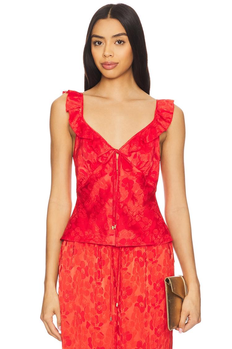 Delicate charmeuse fabric and a fitted silhouette bring romantic elegance to this red cami. Featuring a sweetheart neckline, ruffled shoulder straps, and a front hook and tie closure, it offers a flattering waist-length fit perfect for spring and summer. The all-over floral pattern and ruffle details add a chic, feminine touch. Ideal for casual outings, brunch dates, or a night out, this cami pairs effortlessly with skirts or pants to elevate your warm-weather wardrobe with timeless style.