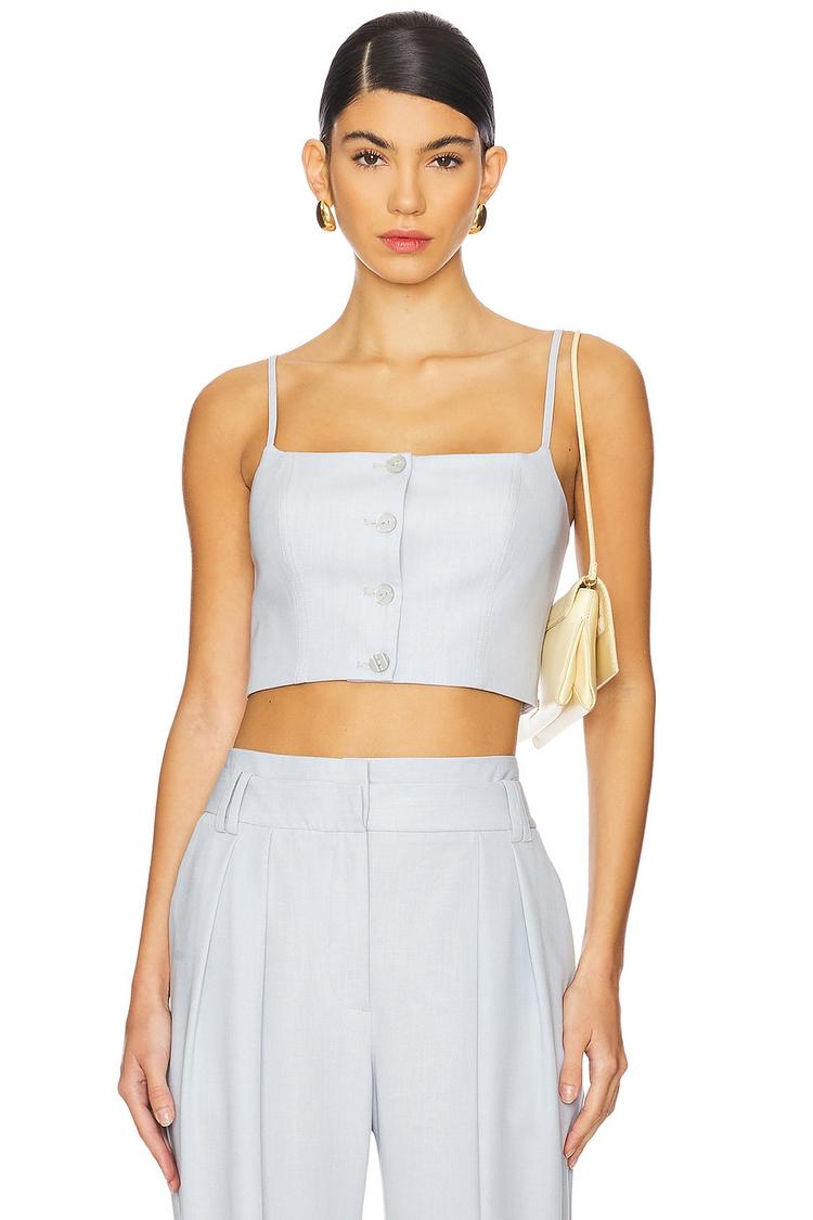 Softly tailored in a midweight linen fabric blend, this Simmons Cropped Cami features a fitted silhouette and a trendy cropped length. Its square neckline and delicate spaghetti straps frame the shoulders elegantly, while the front button closure and adjustable tie-back strap add practical charm. The light gray hue enhances its minimalist, modern appeal, making it an ideal choice for casual brunches, vacation days, or relaxed spring and summer outings. Combining comfort with style, this cami pairs effortlessly with high-waist trousers or skirts for a refined yet easygoing look.