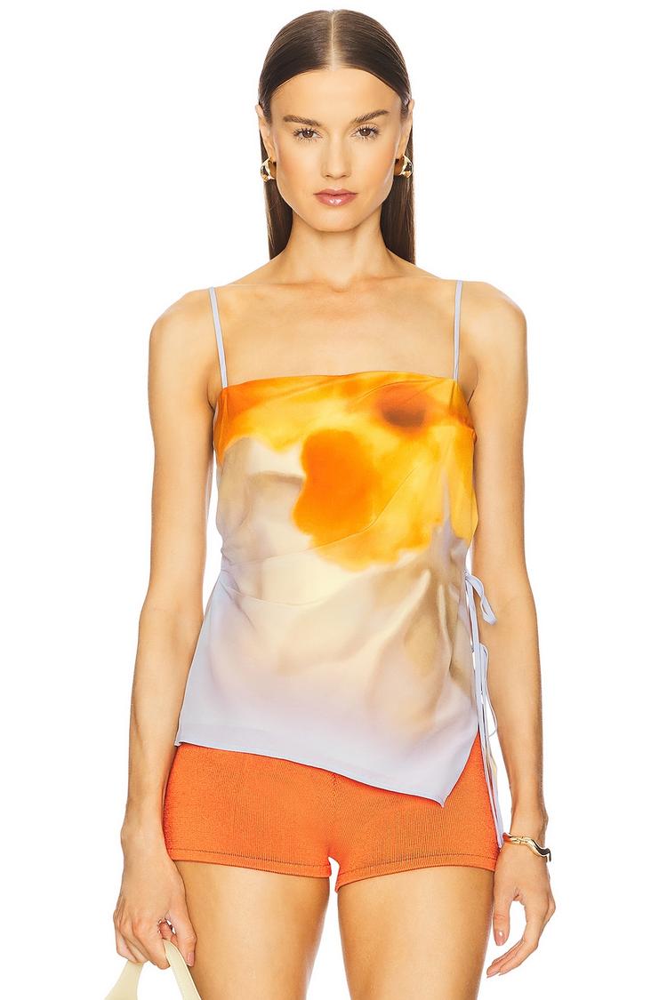 Lightweight silk fabric with a smooth matte finish enhances this chic camisole featuring a slim fit and straight neckline. The sleeveless design with delicate spaghetti straps and an asymmetrical hem creates a modern silhouette. Abstract orange and white hues blend seamlessly across the top, while side tie closures add a subtle functional detail. Perfect for casual days, brunch outings, or date nights during spring and summer, this versatile piece embodies minimalist elegance with a touch of artistic flair.
