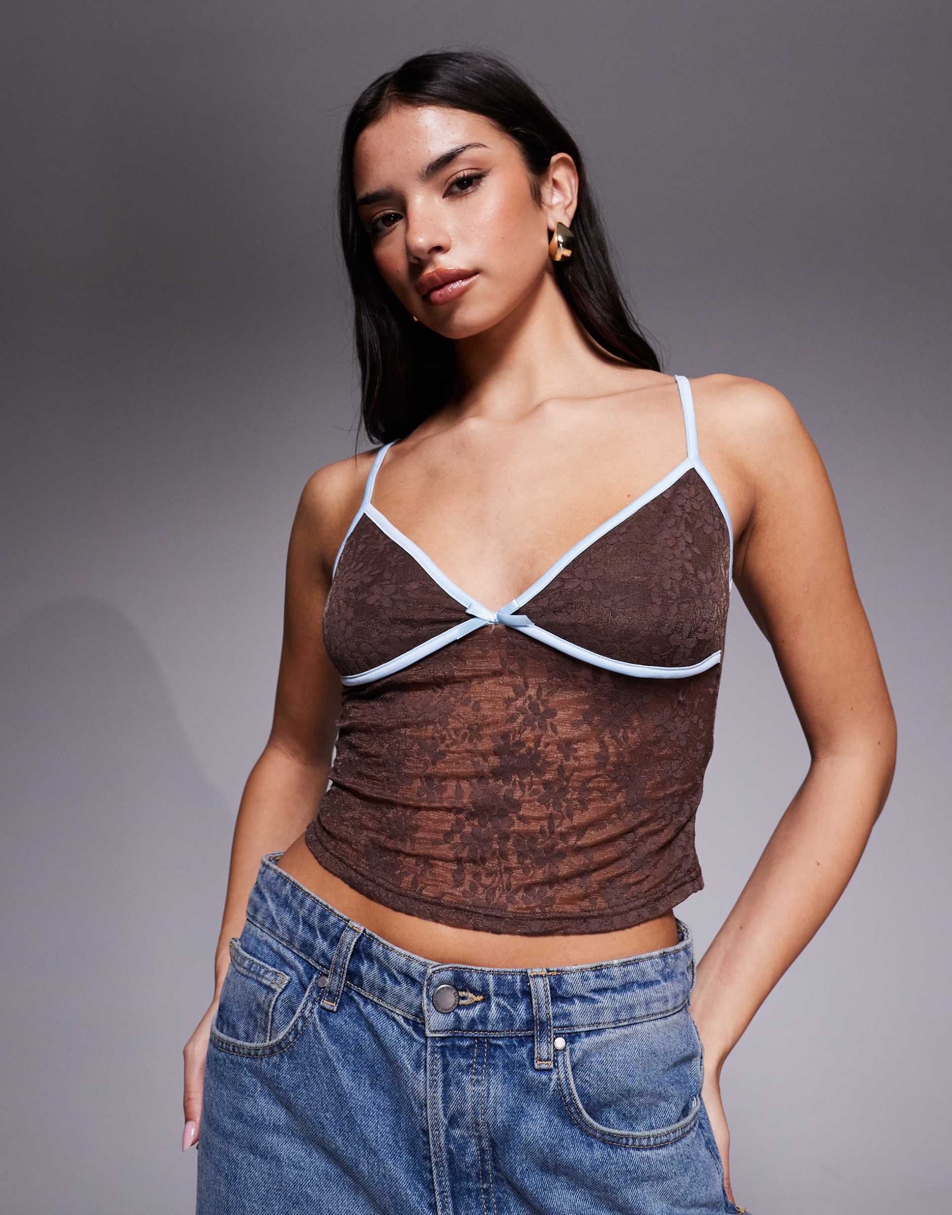 TIGER MIST AUBURN LACE CONTRAST TRIM BOW DETAIL CAMI TOP IN BROWN AND BABY BLUE