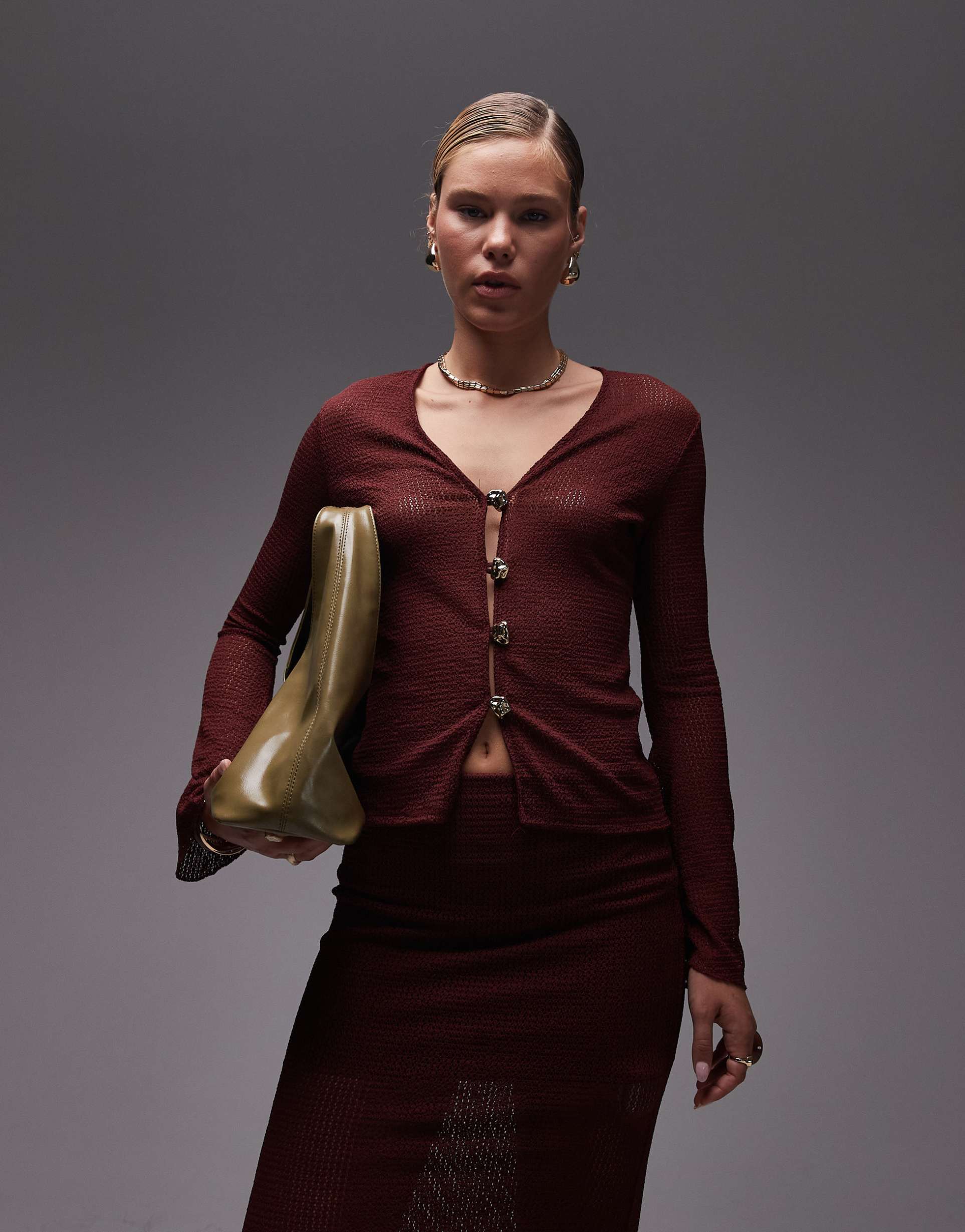 ASOS DESIGN CROCHET PLUNGE FLARED SLEEVE GOLD BUTTON CARDIGAN IN BURGUNDY - PART OF A SET