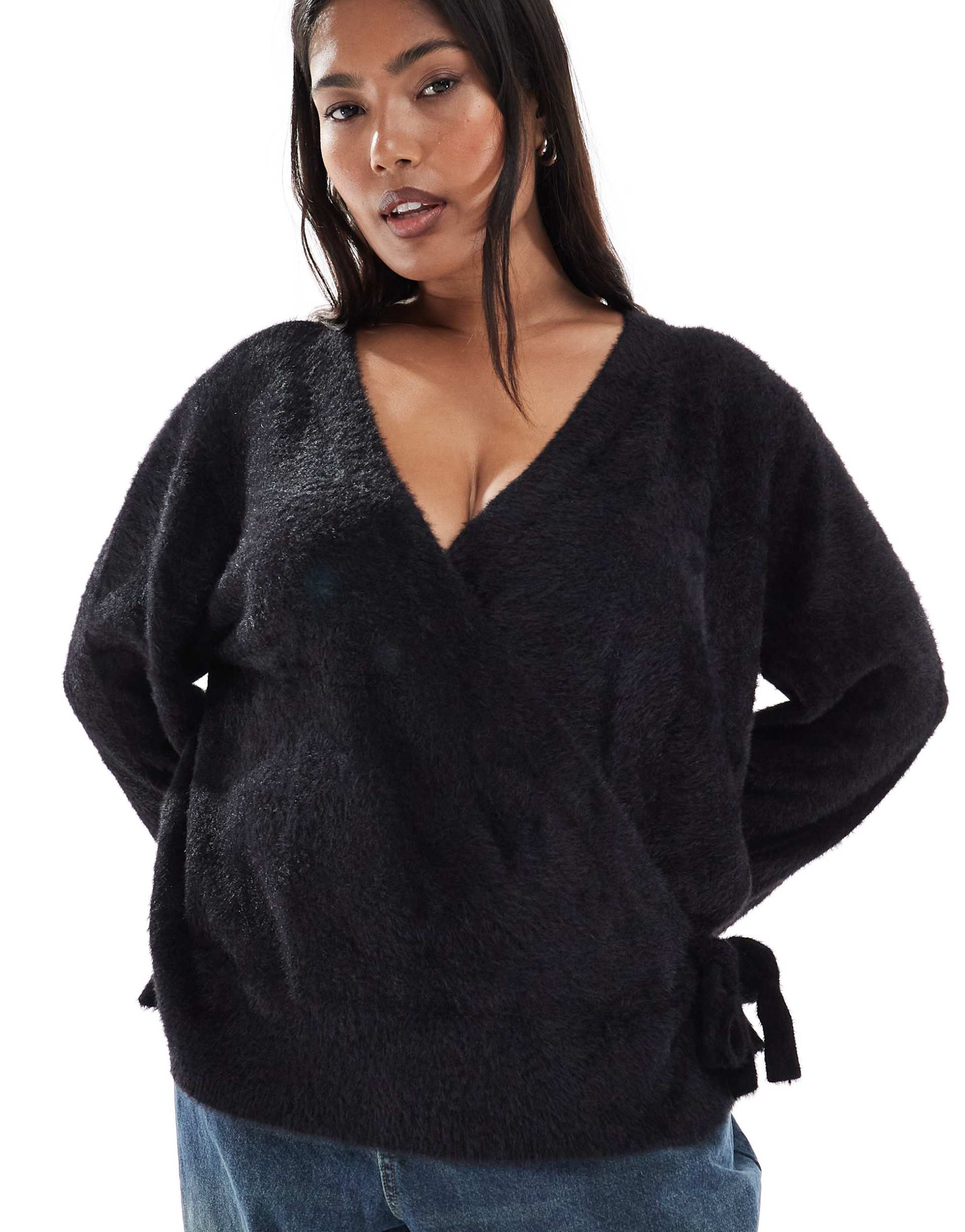 ASOS DESIGN CURVE KNIT EYELASH WRAP CARDIGAN IN BLACK