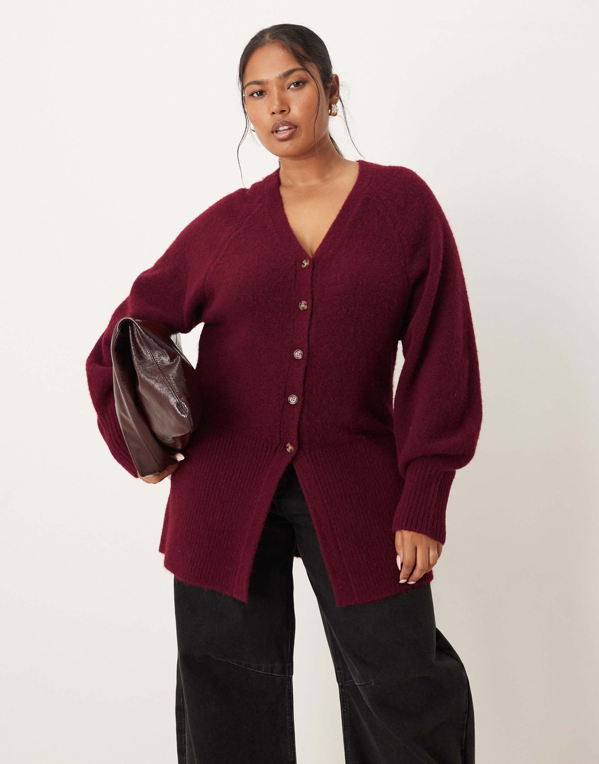 ASOS DESIGN CURVE V-NECK LONGLINE CARDIGAN WITH WAIST DETAIL IN FLUFFY YARN IN BURGUNDY