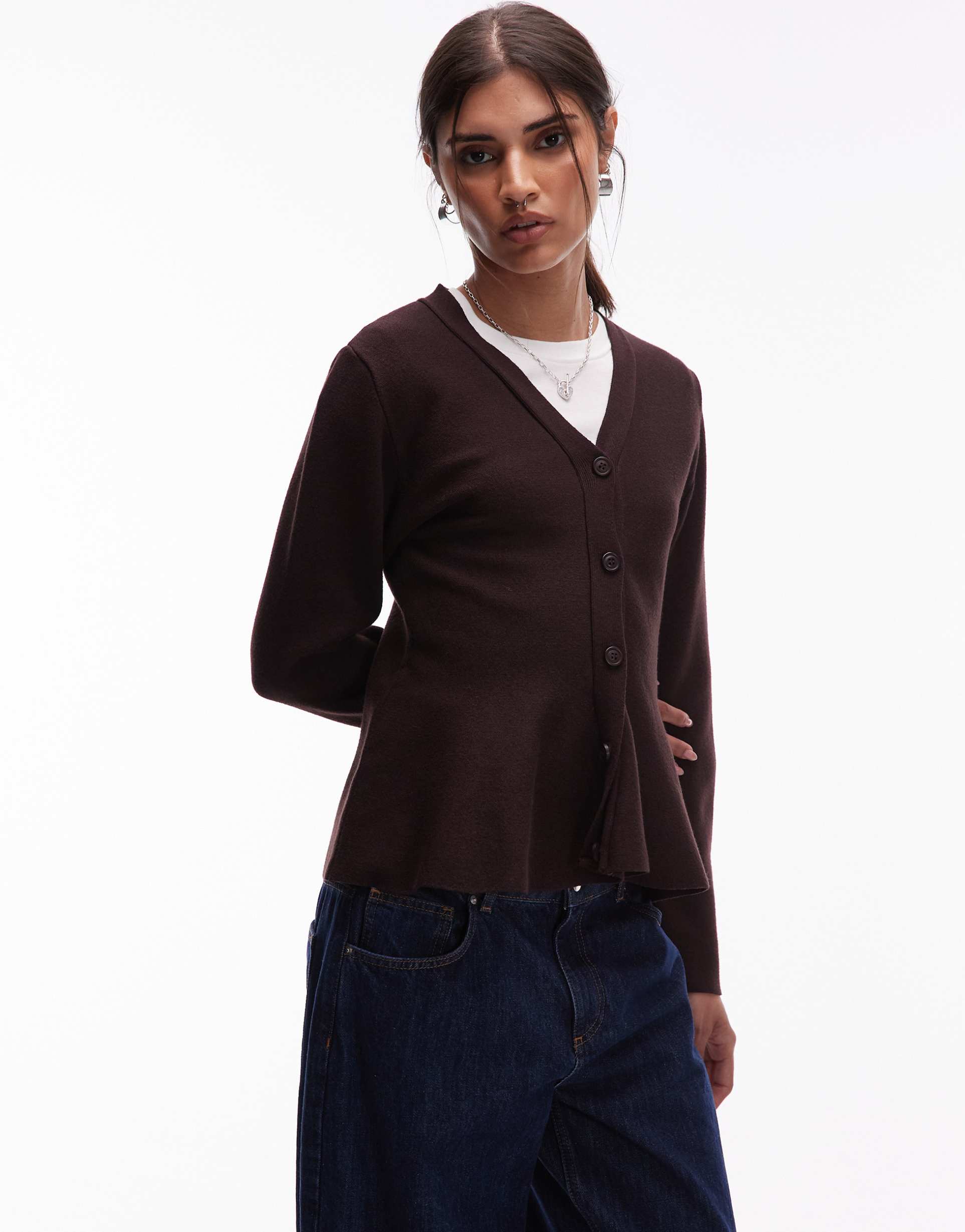ASOS DESIGN KNIT CARDIGAN WITH SCULPTED HEM IN BROWN