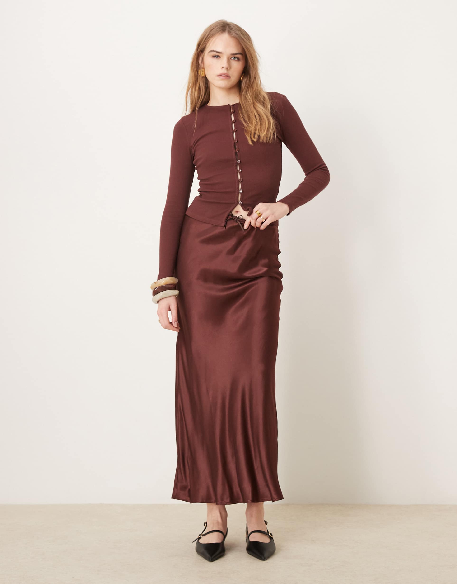 This slim fit, chocolate brown mini rib shrunken cardigan from ASOS DESIGN features a soft and stretchy ribbed cotton-elastane blend. It has a classic round neck and a front button placket for easy closure. The long regular sleeves and close fit make it a versatile layering piece perfect for casual outings, brunches, or date nights during cooler spring, autumn, or winter days. Its minimalist style and matte dark brown color lend a timeless appeal for everyday wear.