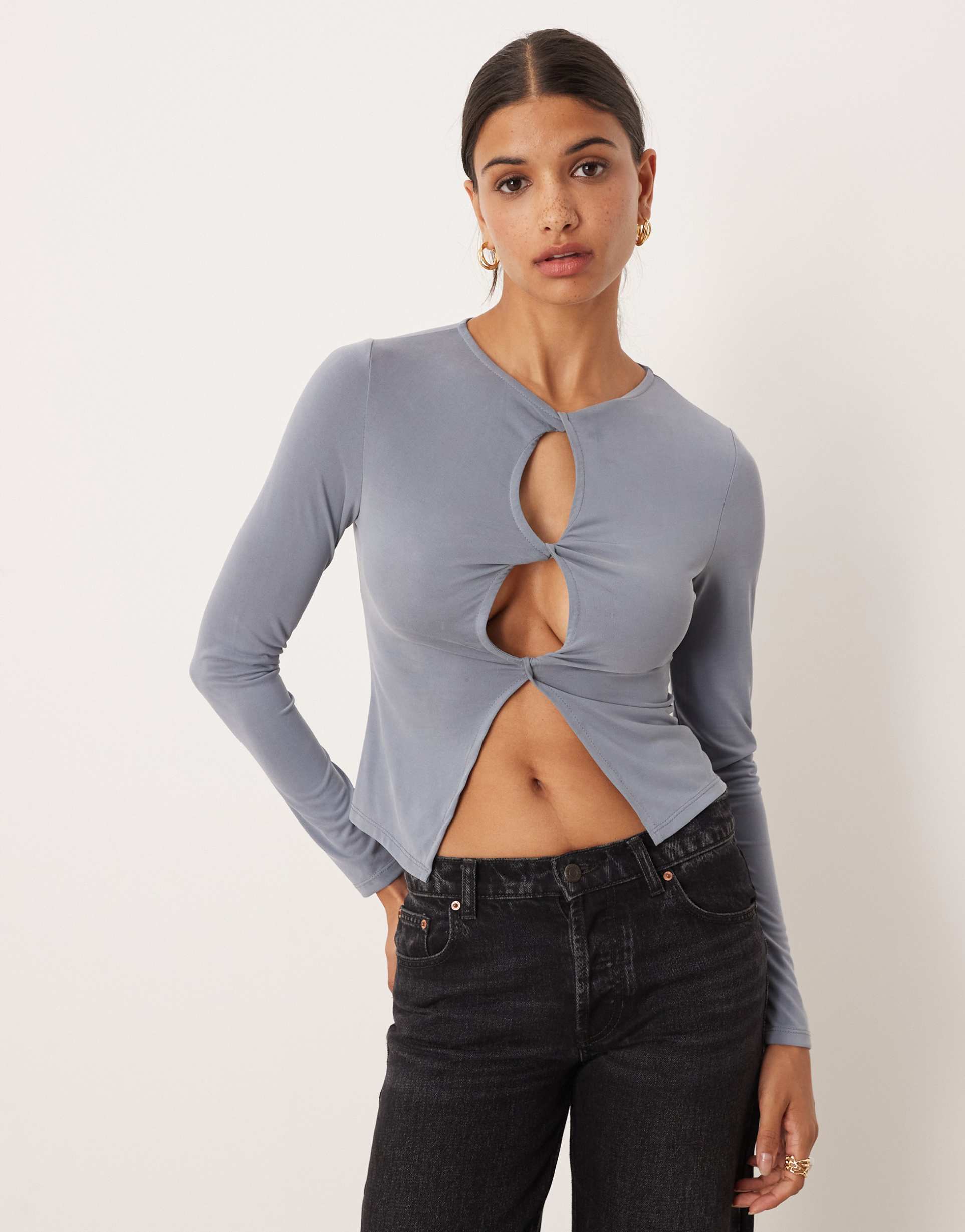 Soft and stretchy polyester jersey defines this cropped, slim fit cardigan in a versatile matte light gray. Featuring long regular sleeves and a classic crew neck, it stands out with unique keyhole cut-outs down the front that add a modern, trendy twist. Ideal for casual days, streetwear vibes, or layered looks in all seasons, this piece blends comfort and style effortlessly. The button closure and fitted silhouette enhance wearability, making it perfect for everyday wear or relaxed social outings.