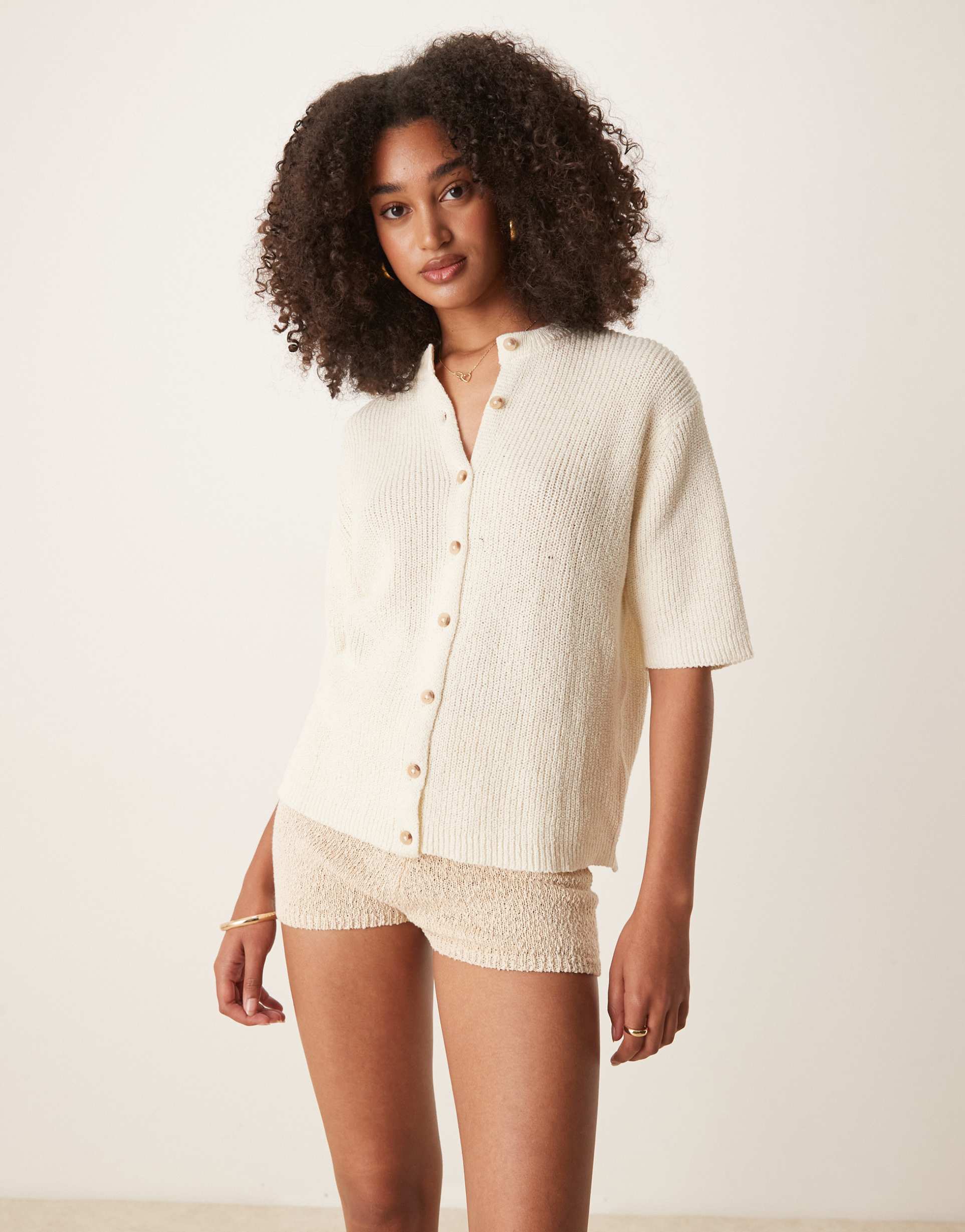 ASOS DESIGN SHORT SLEEVE BOUCLE CARDIGAN IN CREAM