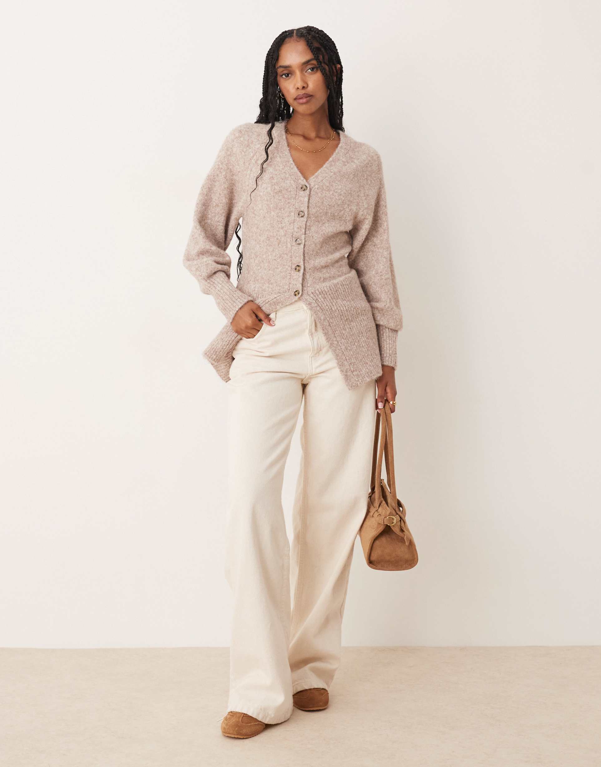 This ASOS DESIGN longline cardigan in a matte beige oatmeal shade offers a soft, fluffy knit texture that adds cozy appeal. Featuring a flattering V-neckline and a button front closure, it has long sleeves and a regular fit for comfortable everyday wear. The full-length silhouette extends to provide warmth and style with a waist detail enhancing the shape. Crafted from a blend of polyester, acrylic, nylon, wool, and elastane, this cardigan is perfect for casual outings, relaxed brunches, or loungewear during autumn, winter, and spring.