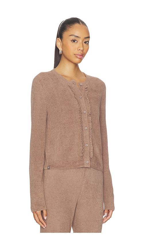 BAREFOOT DREAMS COZYCHIC ULTRA LITE POINTELLE RIB RUFFLE FRONT CARDIGAN IN BROWN.
