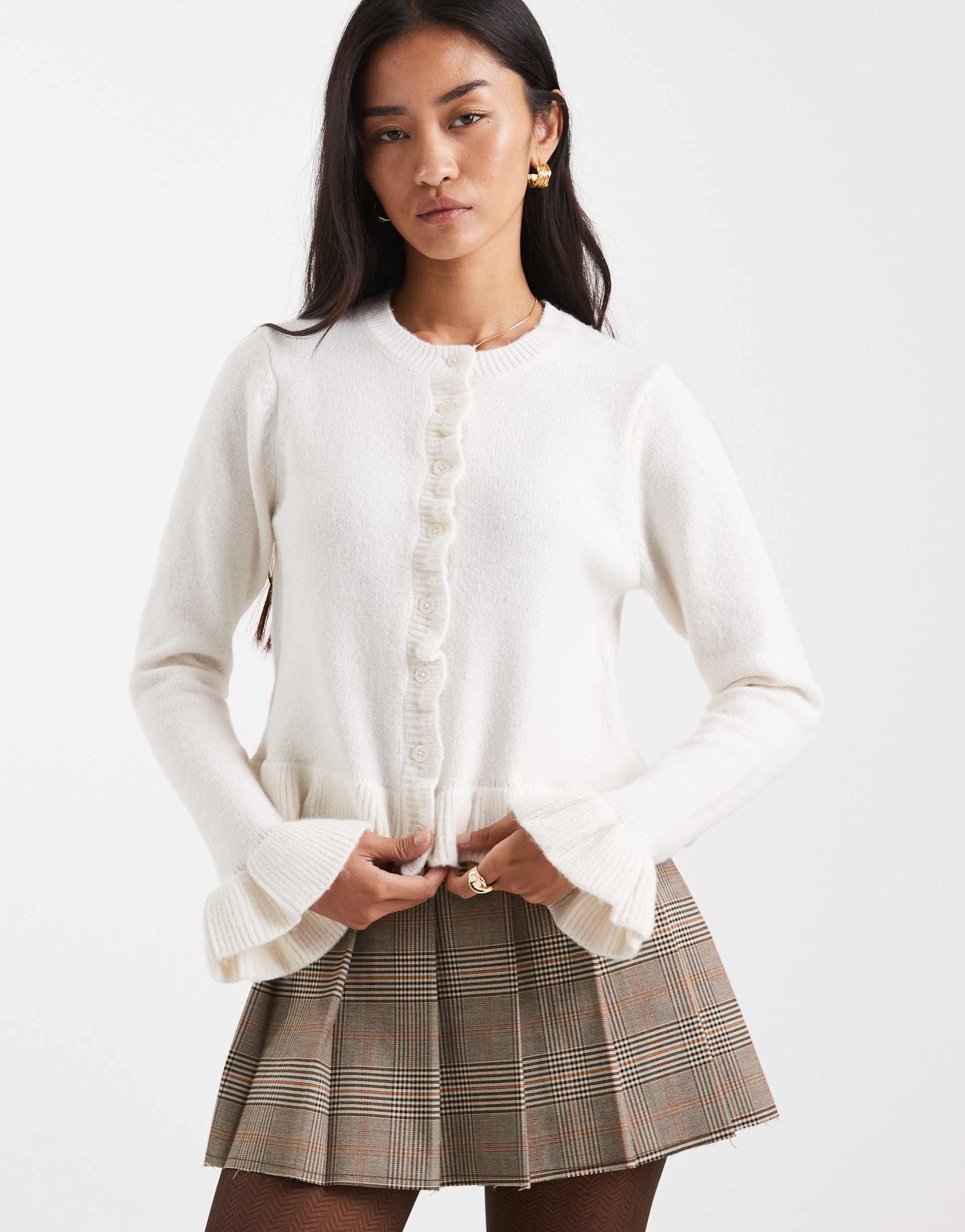 BRAVE SOUL CREW NECK KNIT CARDIGAN WITH RUFFLE CUFFS AND HEM IN IVORY