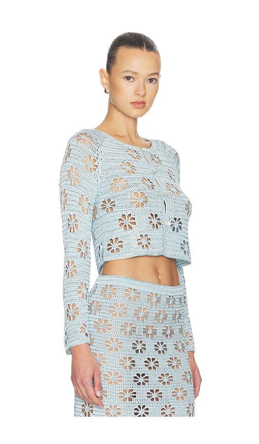 CALLE DEL MAR FLORAL CROCHET CARDIGAN IN BABY BLUE.