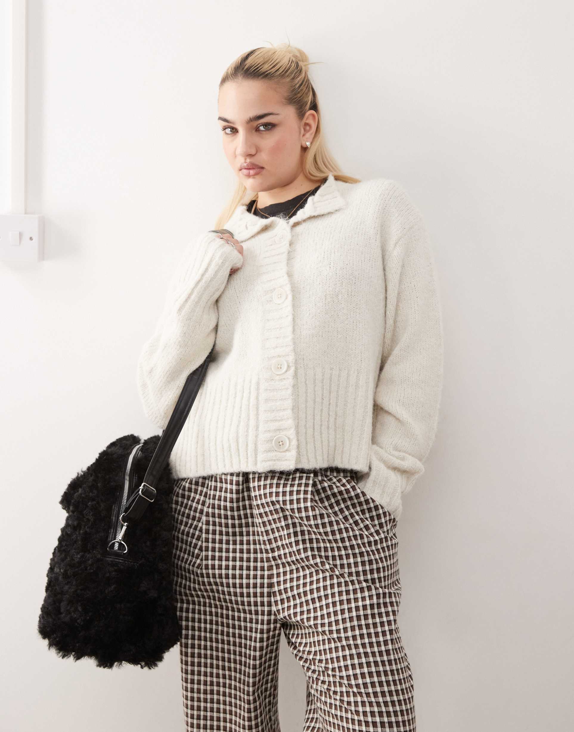 COLLUSION FLUFFY TEXTURED CREW NECK CARDIGAN IN CREAM
