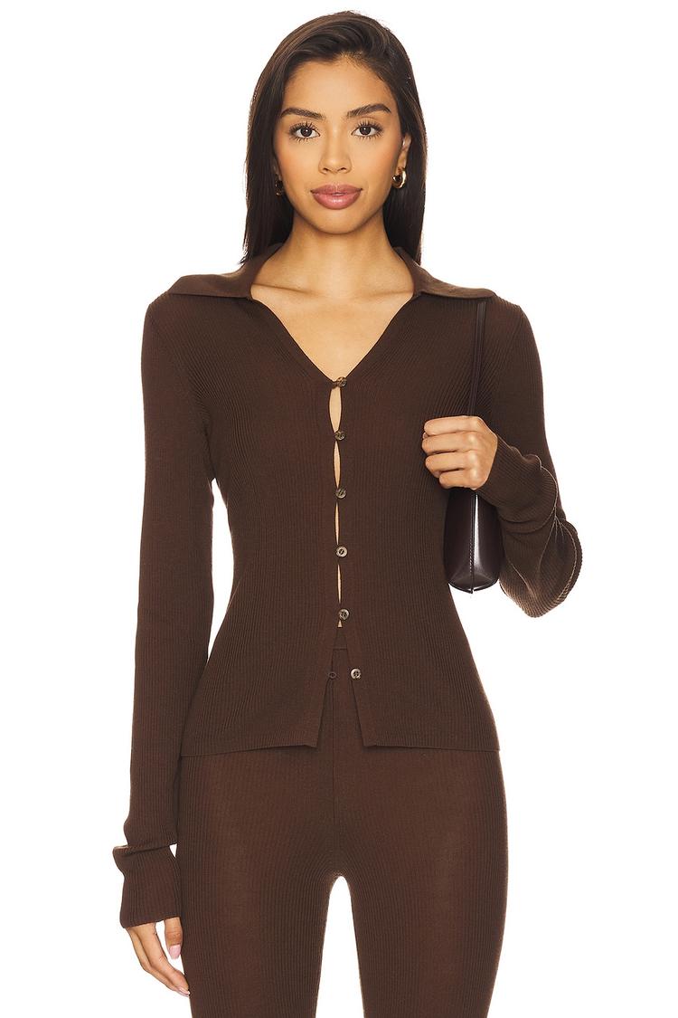 Soft rib knit fabric and a fitted silhouette define this Bailee Rib Cardigan in a rich matte brown. Featuring a classic collar and long sleeves, its lightweight wool and lyocell blend offers cozy warmth perfect for autumn through spring. The front loop button closure adds a timeless touch to this hip-length cardigan, making it ideal for casual days, workwear, or business casual settings. Its minimalist, elegant style pairs effortlessly with a variety of outfits, ensuring versatile wear across seasons and occasions.