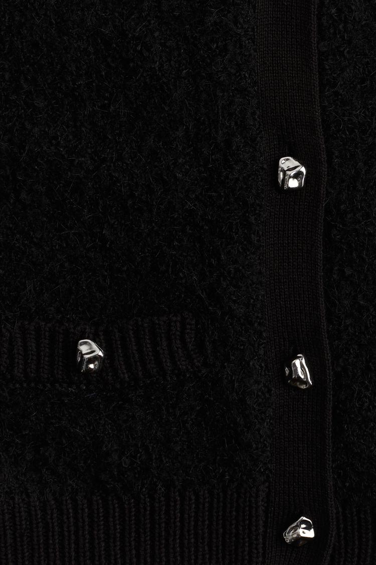This black bouclé-knit cardigan features a soft, textured fabric with a classic round neckline and long sleeves. Its waist-length silhouette offers a regular fit, complemented by ribbing at the neckline, cuffs, pocket welts, and hem for subtle detailing. The front closure showcases metal buttons, mirrored on the decorative welt front pockets, adding a refined metallic touch. Perfect for casual outings, workwear, or business casual settings in cooler seasons like autumn, winter, and spring, this cardigan blends comfort with understated elegance.