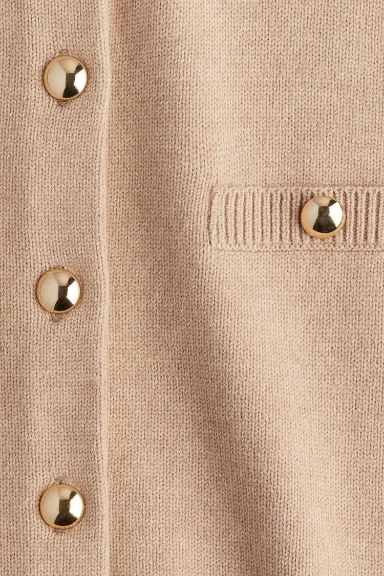 beige cardigan with metallic buttons