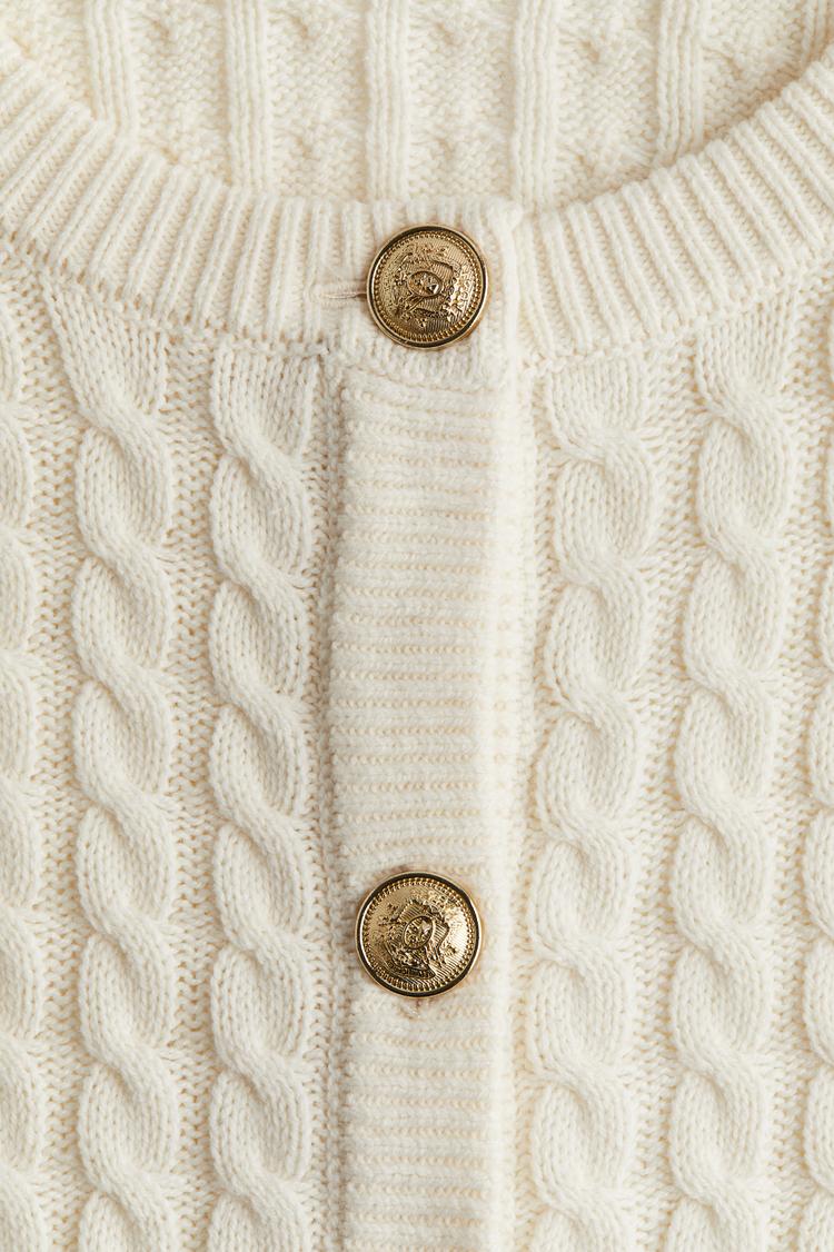 Short, fitted cardigan in a soft, cable-knit cotton blend. Round neckline, metal buttons at front, and ribbing at neckline, placket, cuffs, and hem.