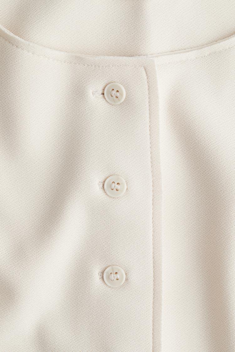 This off-white cardigan features a tailored fit with a defined waist and long tapered sleeves. Crafted from dense polyester jersey, it showcases a round neckline and front button closure that extends to the waist. The heavily dropped shoulders add a modern touch to its classic silhouette, perfect for spring and autumn wear. Raw edge detailing enhances its minimalist style, making it ideal for casual, business casual, and workwear occasions. The textured fabric adds subtle interest, combining comfort and sophistication in one versatile piece.