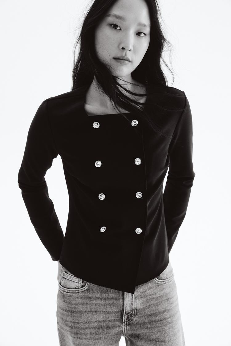 This double-breasted cardigan features a slim fit with a waist-length silhouette, crafted from crepe jersey polyester fabric. It showcases a modern square neckline and long drop-shoulder sleeves, complemented by textured metal buttons for closure. Raw-cut edges add a subtle edgy detail to the classic minimalist style. Perfect for casual days, office workwear, or business casual occasions during spring and autumn seasons, this cardigan pairs well with jeans or tailored pants for versatile layering options.