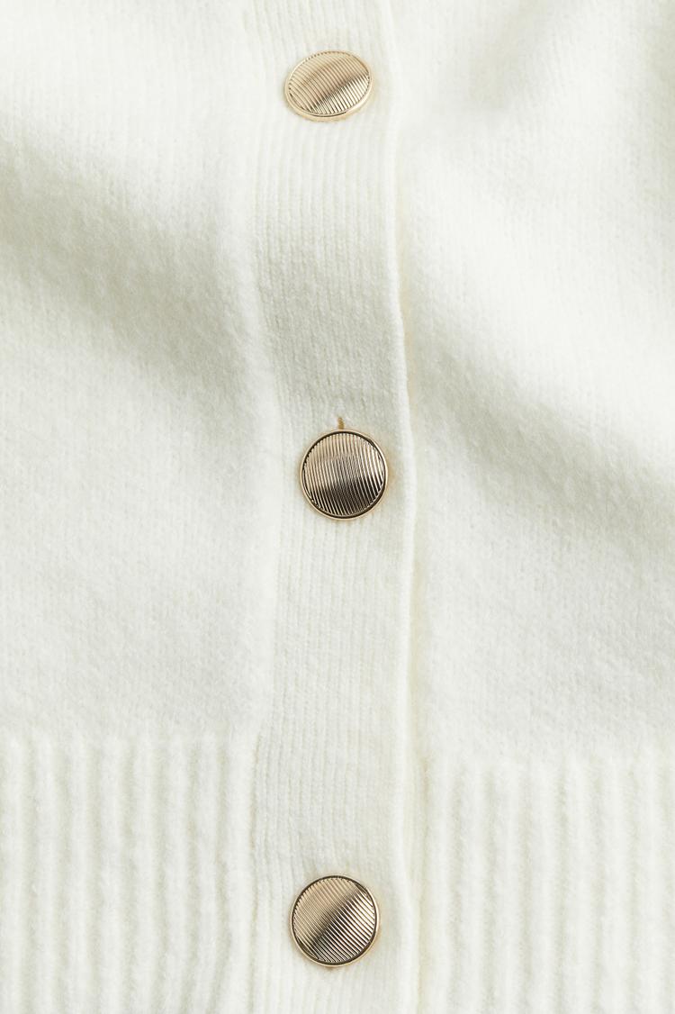 This off-white cropped cardigan offers a classic and minimalist style crafted from soft, fine knit fabric. Featuring a round neckline and long, regular sleeves, it closes with metal buttons down the front. Ribbed detailing trims the neckline, cuffs, and hem, adding subtle texture to the clean silhouette. Ideal for casual outings, brunches, or light workwear layering in spring and autumn, this regular-fit cardigan pairs effortlessly with skirts or trousers for versatile styling options.