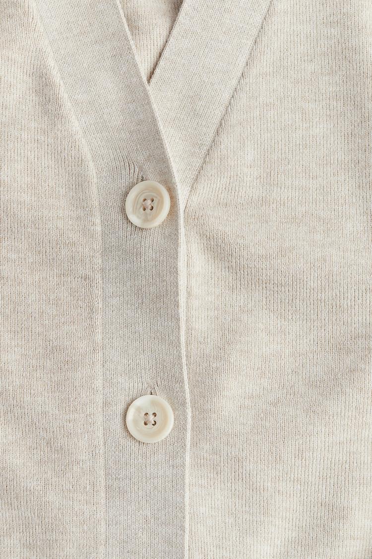This fine-knit cardigan in a soft beige hue features a low-cut V-neck and relaxed fit with dropped shoulder sleeves for a casual chic look. The front button closure and ribbing at the cuffs and hem enhance its minimalist style. Waist-length and crafted from a comfortable knit fabric, this cardigan is ideal for layering during spring and autumn. Perfect for casual outings, loungewear, or workwear, it combines subtle design with versatile wearability.