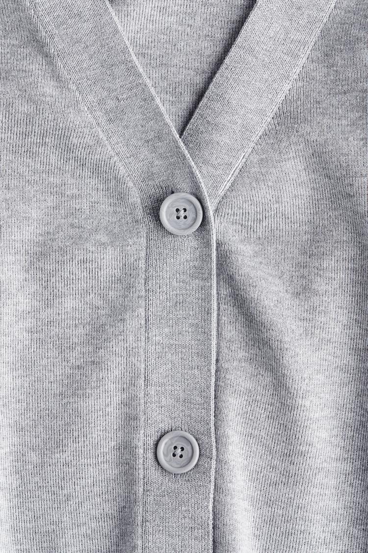 This fine-knit cardigan in soft gray features a relaxed fit with dropped shoulders and long sleeves, perfect for layering. The low-cut V-neckline and front button closure add classic detail, while ribbing at the cuffs and hem gives subtle texture. Its hip-length silhouette offers casual comfort, making it an ideal choice for casual outings, loungewear, or transitional seasons like autumn and spring. Crafted in a smooth knit fabric, this cardigan combines minimalist style with cozy ease.