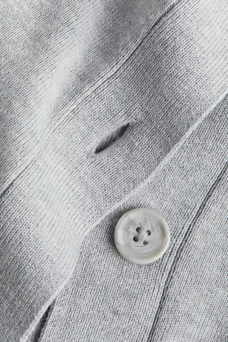 This fine-knit cardigan features a soft, light gray knit fabric with a relaxed fit that drapes comfortably at waist length. It showcases a low-cut V-neckline and dropped shoulder sleeves for a casual silhouette. The long sleeves end with ribbed cuffs, and the hem also has ribbing for subtle texture. Front button closure adds classic charm to this minimalist piece, perfect for casual outings, loungewear, or layering at work during cooler spring, autumn, or winter days.