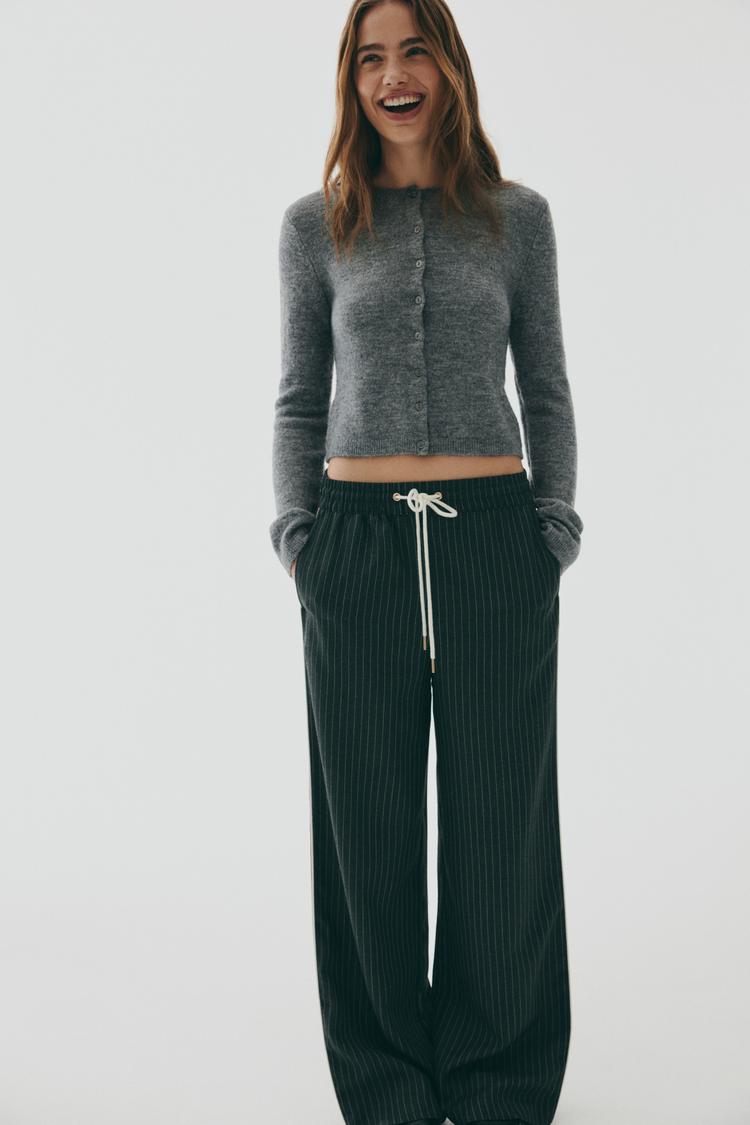This fine-knit cardigan features a fitted silhouette with a cropped length and long regular sleeves. Crafted in a soft, textured gray knit fabric, it has a classic round neckline and a button closure down the front. Ideal for layering during cooler spring, autumn, or winter days, this minimalist and casual chic piece suits casual outings, loungewear, or workwear settings. The cardigan’s subtle texture and neutral tone make it a versatile staple for refined everyday wear.