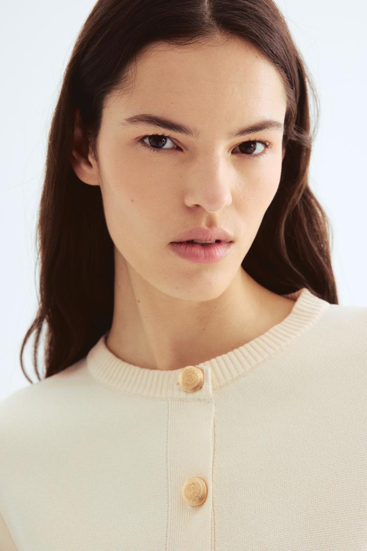 This fine-knit cardigan in a soft cream hue features a classic crew neck and long sleeves, designed for a regular fit that comfortably hits the hip length. The front button closure is adorned with elegant, subtly textured buttons that add a touch of sophistication to its minimalist style. Crafted from a smooth knit fabric, this cardigan is ideal for layering in transitional seasons like spring and autumn, making it a versatile piece suitable for casual outings, workwear, or business casual settings.