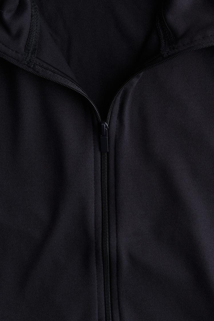 This fitted black jersey cardigan features a soft, brushed finish for comfort and a sleek look. It has a stand collar and long raglan sleeves that enhance ease of movement. The front zipper closure offers practicality, while the anti-chafe flatlock seams provide a smooth, irritation-free fit. Perfect for casual wear, workwear, or loungewear during spring and autumn, this minimalist piece balances comfort with style for versatile layering.