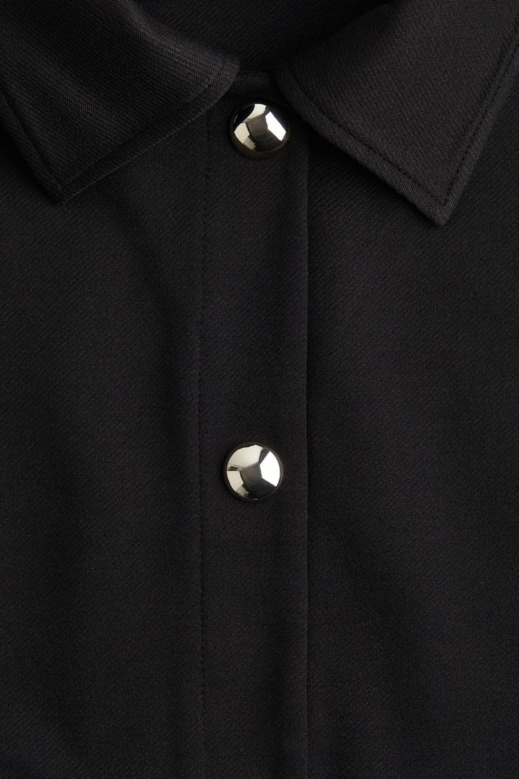 This black jersey cardigan features a waist-length blouson silhouette with a regular fit, perfect for layering in spring, summer, and autumn. It has a classic turn-down collar and half-length sleeves, complemented by shiny button closures down the front. Crafted from soft jersey fabric, this minimalist piece offers casual chic versatility suitable for casual outings, streetwear looks, and workwear ensembles. Its clean, solid black design makes it an easy-to-style staple for everyday wear.