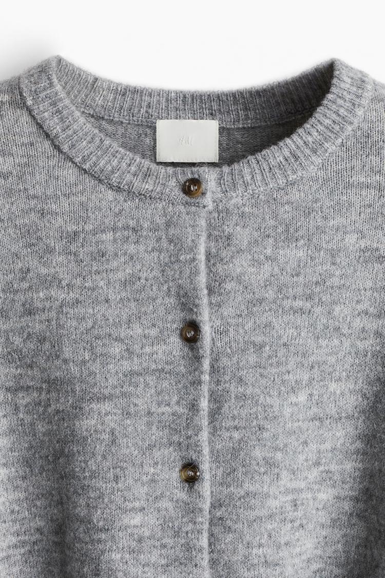 This knit cardigan features a soft wool blend fabric with a cozy, textured knit finish perfect for cooler seasons. It has a classic round neckline and long, regular sleeves, complemented by ribbed detailing at the neckline, cuffs, and hem. The waist-length fit and button-front closure provide a versatile, casual chic silhouette ideal for casual wear, loungewear, or light workwear layering. Its matte gray color enhances its minimalist style, making it an effortless layering piece for autumn, winter, or spring occasions.