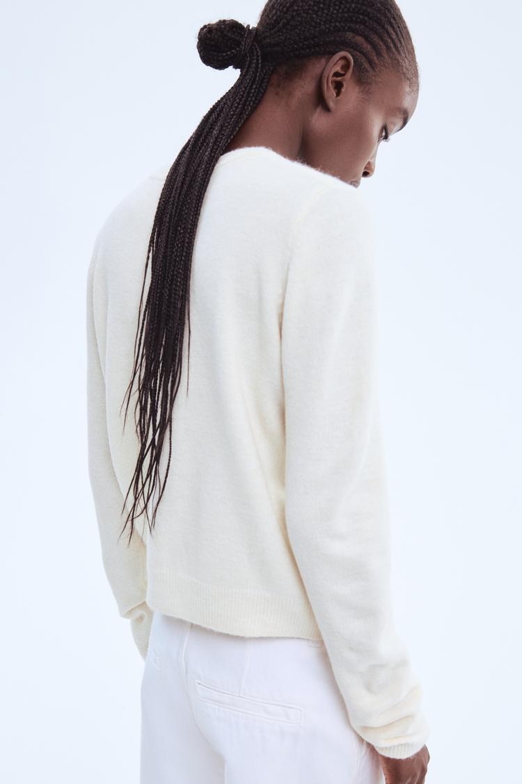 This classic knit cardigan features a cream color with a soft wool fabric that offers warmth and comfort. Designed with a crew neck and long regular sleeves, it closes with a row of front buttons for a timeless silhouette. The cardigan fits regularly and ends at the waist, making it an ideal layering piece for casual outings, loungewear, or light workwear during autumn, winter, or spring seasons. Its minimalist style and covered back contribute to a versatile and understated look.