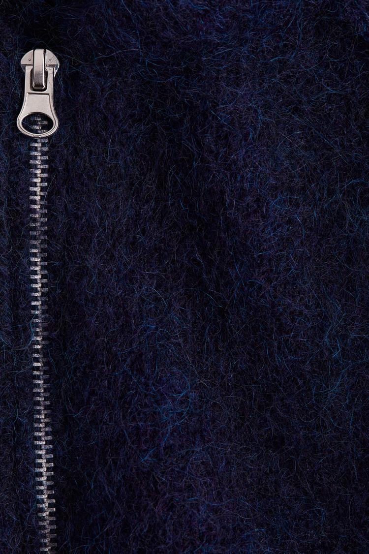 This mohair-blend cardigan features a textured, fluffy knit in a deep dark blue hue, offering cozy warmth for autumn and winter seasons. Its blouson silhouette with a waist-length cut and regular fit creates a relaxed yet chic look. The front zipper closure and exposed silver zipper detail add a modern edge, complemented by a simple round neckline and long regular sleeves. Perfect for casual outings, loungewear, or travel, this versatile cardigan blends comfort and style effortlessly.
