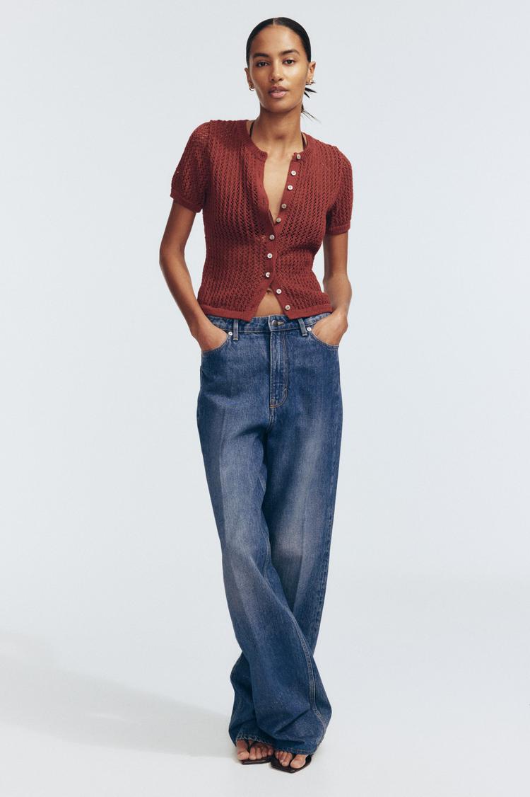 This fitted pointelle-knit cardigan in a matte dark red hue offers a textured, breathable fabric ideal for casual wear. Featuring a round neckline and half sleeves, it fastens with front buttons and ends at the waist for a flattering silhouette. Perfect for spring to autumn, it pairs well with denim for brunch, relaxed loungewear, or casual outings. Its minimalist yet chic style embraces comfort without sacrificing sophistication, making it an essential lightweight layering piece.