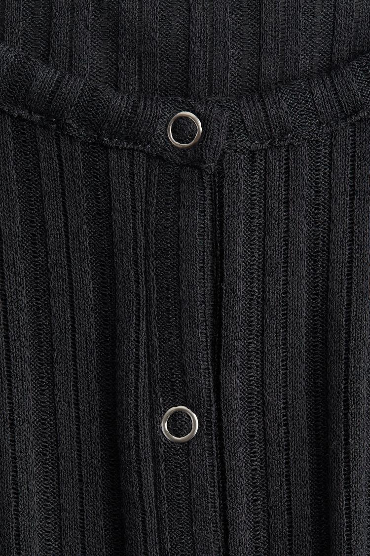 This fitted rib-knit cardigan features a sheer, textured knit fabric that adds subtle dimension to the classic silhouette. It has a round neckline and long sleeves with overlocked edges at the cuffs and hem for a clean finish. Snap fasteners at the front provide easy closure. Ideal for casual wear or lounging in spring and autumn, this minimalist cardigan combines comfort with effortless style.