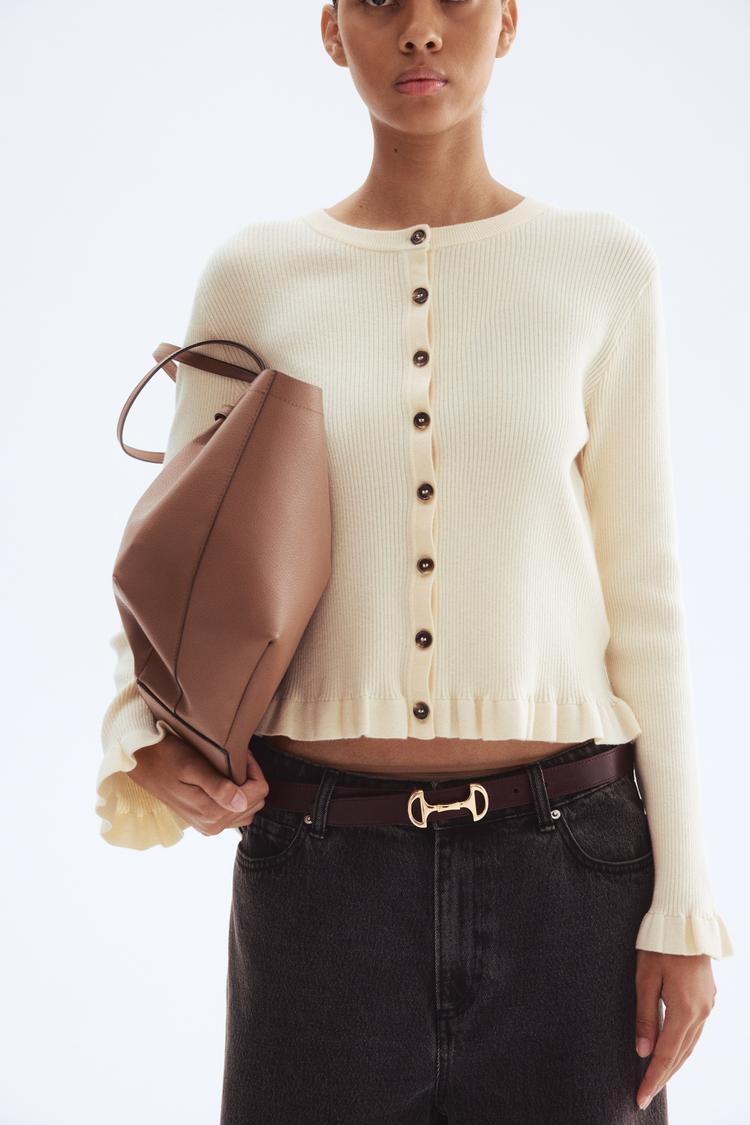 This rib-knit cardigan features a fitted silhouette with a round neckline and long regular sleeves, perfect for transitional seasons like spring and autumn. The creamy knit fabric provides a soft texture complemented by delicate ruffles at the hem and cuffs, adding subtle feminine detail. Front button closures enhance its classic, minimalist style while the waist-length cut makes it versatile for casual outings, workwear, or relaxed brunch settings. Its comfortable fit and refined design make it an essential layering piece for everyday wear.