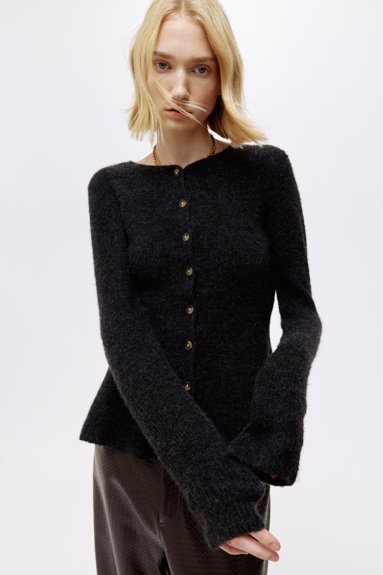 This rib-knit peplum cardigan in matte black offers a fitted silhouette with a classic round neckline and long regular sleeves. The waist-length cut features a flattering peplum flare and front button closure with tortoiseshell-style buttons, adding subtle design interest. Crafted from textured knit fabric, it is ideal for autumn, winter, and spring casual wear, workwear, or a stylish brunch outing. Its elegant simplicity and cozy feel make it a versatile layering piece.