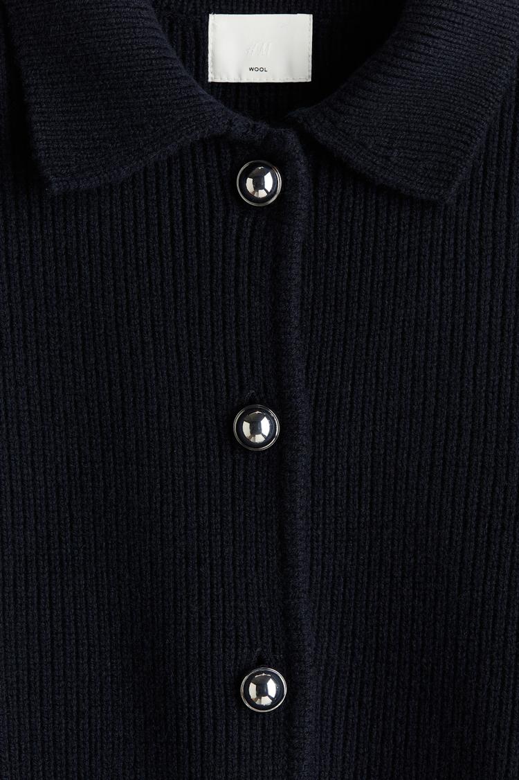 This rib-knit wool cardigan features a classic turn-down collar and button closure, crafted from soft wool fabric ideal for cooler seasons. The textured rib-knit adds subtle visual interest while maintaining a minimalist aesthetic. Designed with long regular sleeves and a regular fit, this cardigan suits casual, workwear, and loungewear occasions, providing versatile layering options for autumn, winter, and spring.