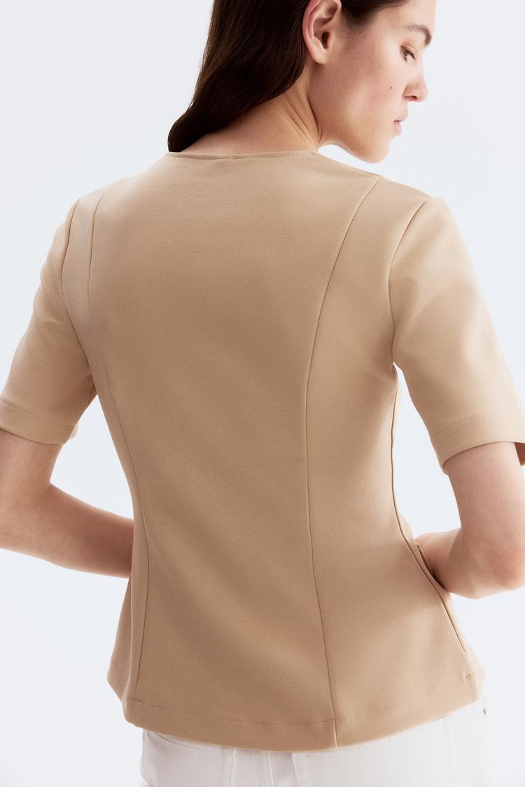 This short-sleeved cardigan features a fitted silhouette crafted from thick polyester jersey with a slight stretch for comfort. It showcases a classic round neckline and snap button closure down the front, complemented by shaping seams that contour the front and back for a sleek look. The waist-length cut and half sleeves make it ideal for spring, summer, and autumn wear. Its minimalist beige tone and subtle decorative front pocket flaps lend it a refined business chic style suitable for casual, workwear, and business casual occasions.