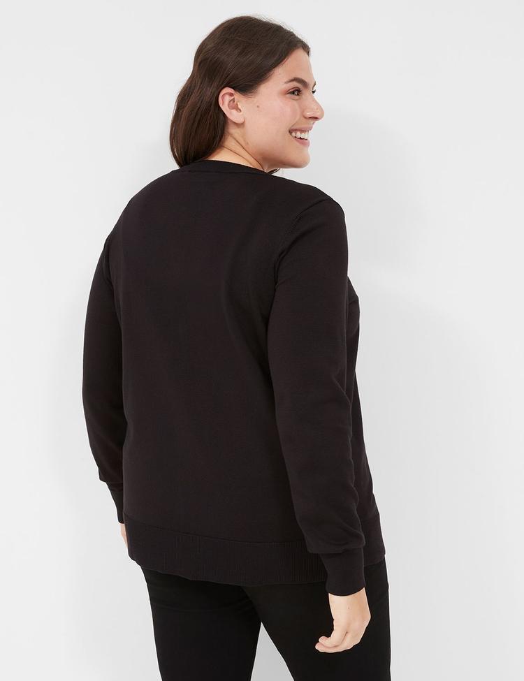 This plus size black button-front cardigan features a classic crew neck and long regular sleeves, crafted from super-soft rayon knit fabric. Its hip-length silhouette offers a regular fit designed to flatter curves comfortably. The cardigan is detailed with ribbed trim and a full button closure for easy layering. Ideal for casual outings, workwear, or business casual environments, it transitions seamlessly through spring and autumn seasons, combining comfort with classic style.