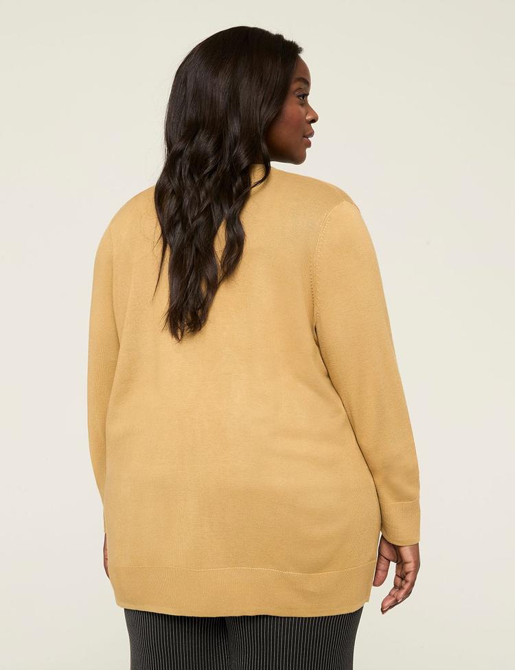 This modern long-sleeve open-front cardigan in a matte tan hue offers a regular fit that flatters plus-size figures. Crafted from super-soft rayon sweater knit, it features ribbed trim along the border and cuffs for subtle texture. The hip-length silhouette and long regular sleeves make it versatile for layering over dresses or tees. Its classic open front neckline complements casual and workwear looks alike. Ideal for cooler spring, autumn, and winter days, this cardigan is a cozy, stylish choice for casual outings, loungewear, or professional settings.